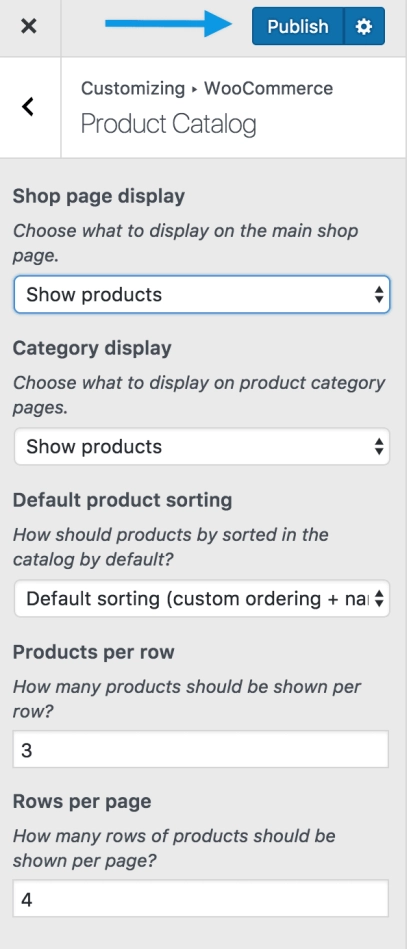 All options for Product Catalog can be found at: Appearance > Customize > WooCommerce > Product Catalog.